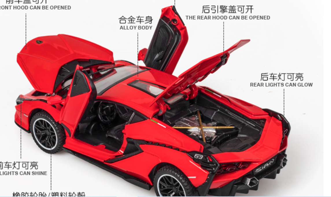 Siêu xe Lamborghini Sian FKP phiên bản mô hình tỷ lệ 1:32 với thiết kế Full Open mở được cả 4 cửa, capo và cốp xe. Hệ thống đèn LED & âm thanh chân thực mang đến trải nghiệm sống động. Mô hình xe đổ trớn (Pull Back) giúp bé chơi vui hơn, đồng thời là món quà sưu tầm lý tưởng cho các tín đồ mê xe.